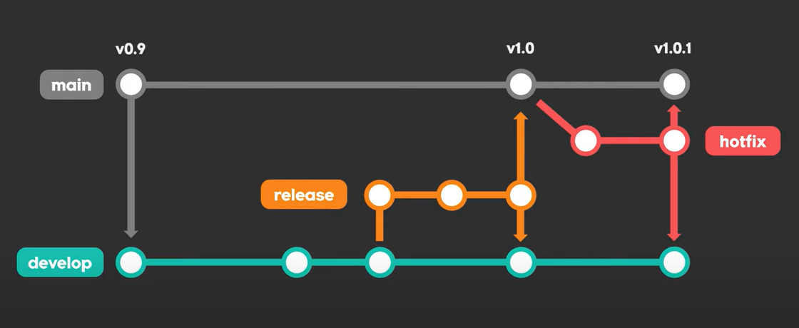 4. 어느정도 develop 브랜치 코드가 완성되었다 싶으면 main 브랜치에 바로 합체해도 좋지만, v1.0을 출시전에 테스트를 하기 위해 release 브랜치를 만들어 마지막 테스트가 완료되면 main에 합쳐서 main을 배포합니다.